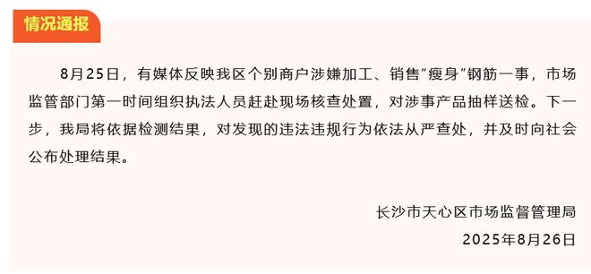 8月25日,有媒体反映我区个别商户涉嫌加工、销售“瘦身”钢筋一事,市场监管部门第一时间组织执法人员赶赴现场核查处置,对涉事产品抽样送检。下一步,我局将依据检测结果,对发现的违法违规行为依法从严查处,并及时向社会公布处理结果。